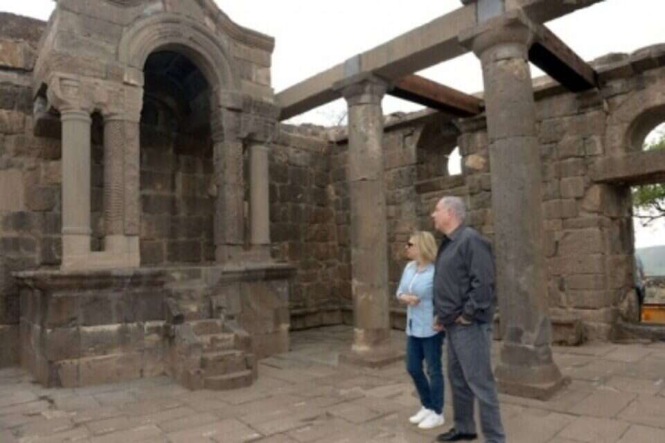 Prime Minister Benjamin Netanyahu and his wife Sara Netanyahu celebrated their 25th wedding anniversary over the weekend with a visit to the Golan Heights. The couple stayed in Moshav Ramot and visited the Gamla Nature Reserve and the ancient synagogue in Um el Kanatir. "Today we also visited the ancient synagogue of Um el Kanatir, in the southern Golan. I was excited to see how the synagogue is being restored. In its heart is the Torah ark made of the local basalt stone, decorated with the historical symbols of the Jewish people."