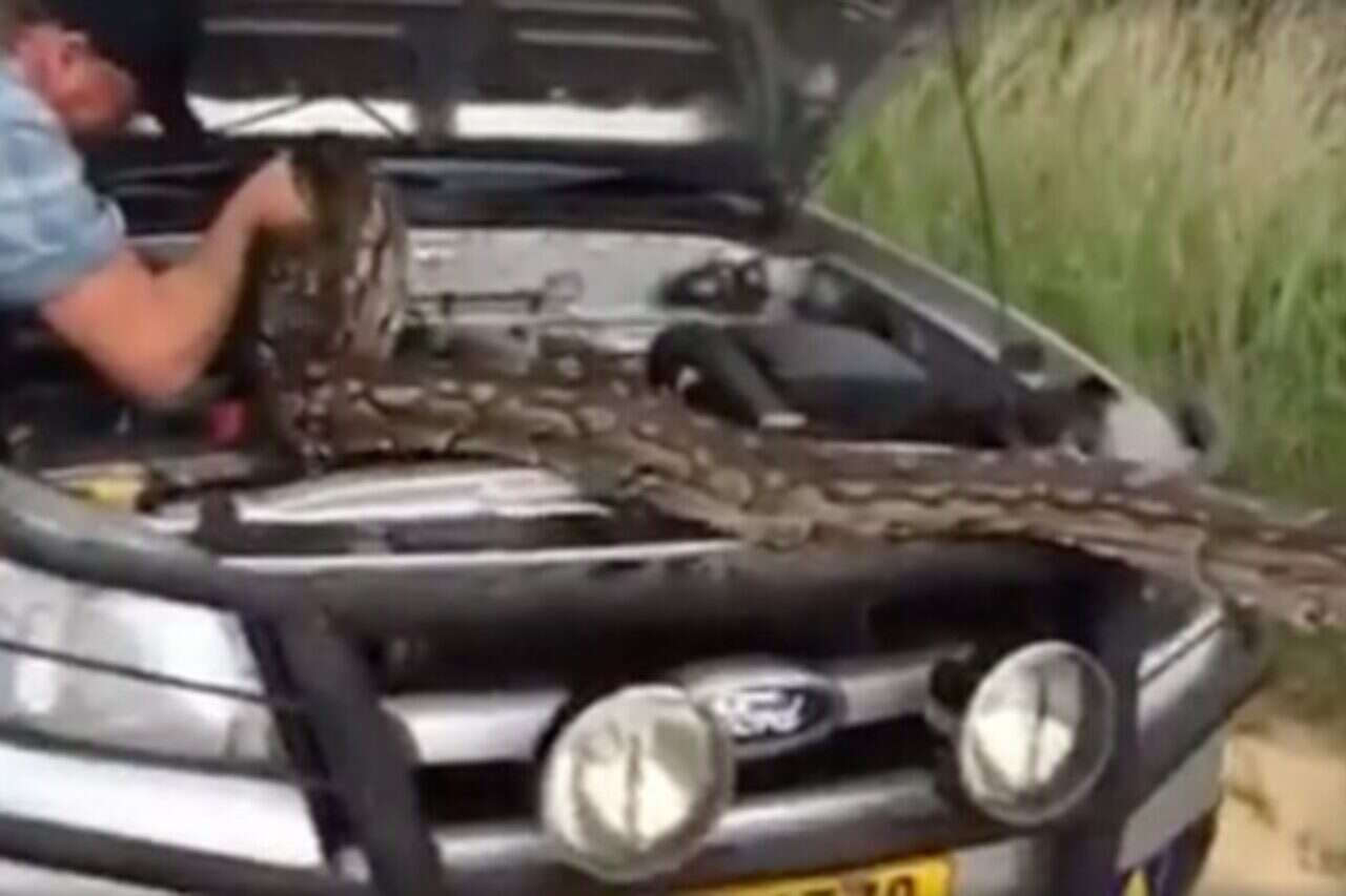 רגעי אימה בנסיעה הביתה: נחש פיתון אימתני התגלה במנוע של מכונית משפחתית בשעה שזו עשתה את דרכה חזרה הביתה.