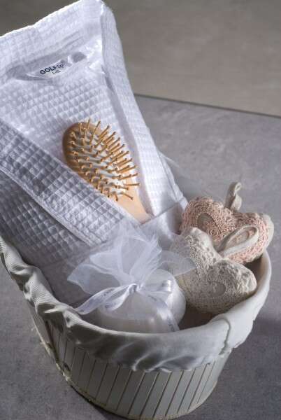 אפשר להשתמש בכלים ואו בקופסאות להנחת מגבות מקופלות או מגולגלות (אני ממליצה לגלגל מגבת ולקשור עם סרט סאטן או ראפיה ולהניח בתוך סלסלת קש).