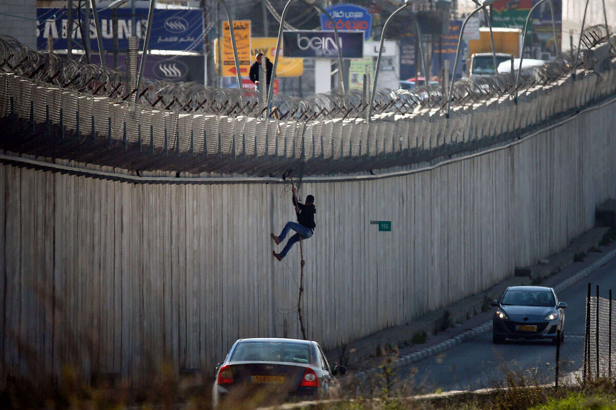 פלשתיני מטפס מעל גדר הביטחון (ארכיון) | צילום: אי.פי.איי