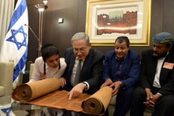 Prime Minister Benjamin Netanyahu met on Monday in Jerusalem with a group of Yemenite Jews who immigrated to Israel in recent days in a covert Jewish Agency operation. One of the immigrants, 50-year-old Rabbi Sliman Yaakov Dahari, brought with him an 800-year-old Torah scroll. "I don't think there is another scroll like this one in the world," Dahari said. "This scroll is sacred to us and it was going to go wherever I went." On Monday, Netanyahu and a young immigrant read from the Torah scroll together. "Welcome to Jerusalem, to the Land of Israel," Netanyahu told the newcomers. "I am very excited to see you here. It is moving that you know to read from the Torah. This is the basis. For many years, we have thought about bringing you and with God's help it happened."