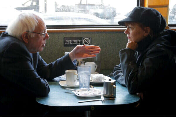 סנדרס משוחח עם השחקנית סוזן סרנדון בדיינר ניו־יורקי // צילום: רויטרס // סנדרס משוחח עם השחקנית סוזן סרנדון בדיינר ניו־יורקי