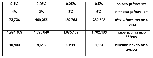 שכיר, נשוי עם ילדים, אשר החל לעבוד בגיל 27 ושכרו בגובה השכר הממוצע במשק, כ- 10,000 ₪ ובחר להפקיד לקרן פנסיה 17.5% משכרו, ישלם במהלך תקופת החיסכון, עד גיל 67 דמי ניהול בהיקף של כ- 363 אלף ₪ . היה ויזכה החוסך להנחה של 50% בלבד, הרי ישלם במהלך שנות החיסכון דמי ניהול בהיקף של 190 אלף ₪. במילים אחרות בגיל הפרישה יהיו לו עוד 173 אלף ₪.