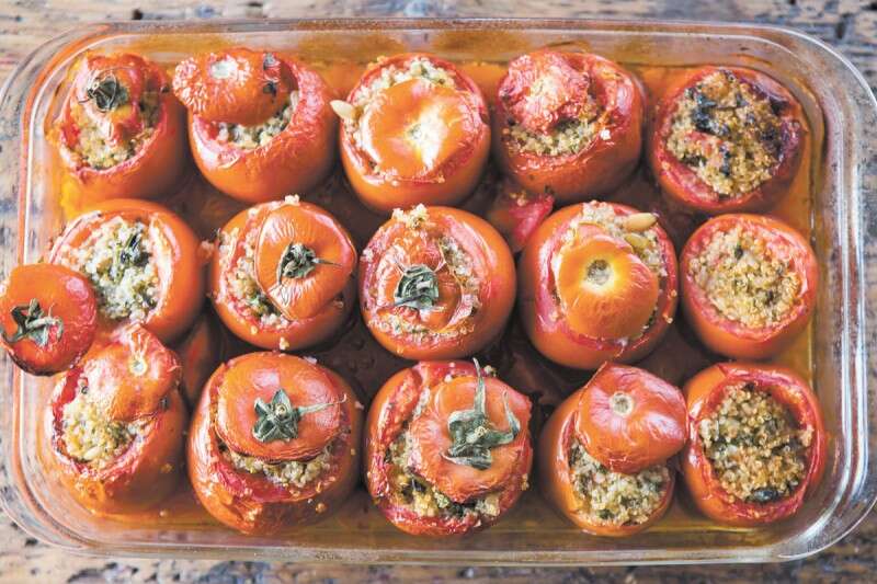 יופי של מנה עיקרית לארוחת סדר טבעונית. קינואה עזת טעמים ממלאת את העגבנייה וביחד מתקבלות יופי של 6 מנות.