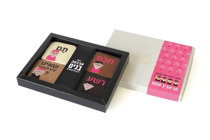 רגע לפני החג, אם טרם קניתם מתנה למארחים, הנה אפשרות יפה ומתוקה: מארז פרלינים ענקיים בסימן "ארבעה בנים", הכולל את ארבע דמויות ההגדה מאוירות בשוקולד. זהירות: לדמות הרשע הוסיפו צ'ילי חריף.
