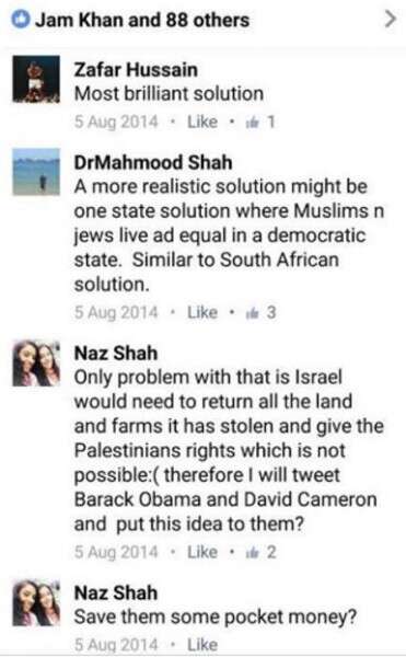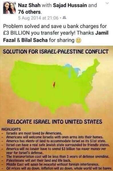 חברת הפרלמנט הבריטי נָז שָאה, מטעם מפלגת הלייבור, הוכרחה להתנצל אחרי שהתגלה כי לפני כשנתיים הציעה "להעביר" את מדינת ישראל לארה"ב. שאה, ששימשה בשנת 2014 (אז העלתה לפייסבוק את הפוסט המקומם) כעוזרת פרלמנטרית, פירסמה פוסט אנטישמי, בה נראית מפת ארץ ישראל בתוך מפת ארה"ב.