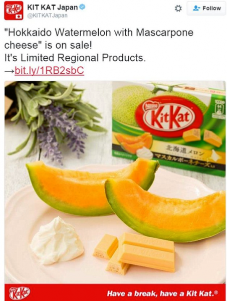 הקיט קט החדש הוא בטעם מלון וגבינת מסקפורנה. החטיף נמצא על המדפים בחנויות נבחרות ביפן.