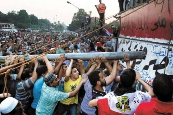 18:00 השוטרים והחיילים המצרים שאיבטחו את מתחם השגרירות ניסו למנוע מההמון להתקרב אל חומת הבטון שהוצבה לאחרונה סביב המתחם כדי להגן עליו, אלא שבתוך זמן קצר הצליחו המפגינים באמצעות מוטות ברזל עבים להפיל את החומה. הם פרצו לבניין המשרדים הגבוה, שבקומות ה-19-16 שלו ממוקמת השגרירות הישראלית.