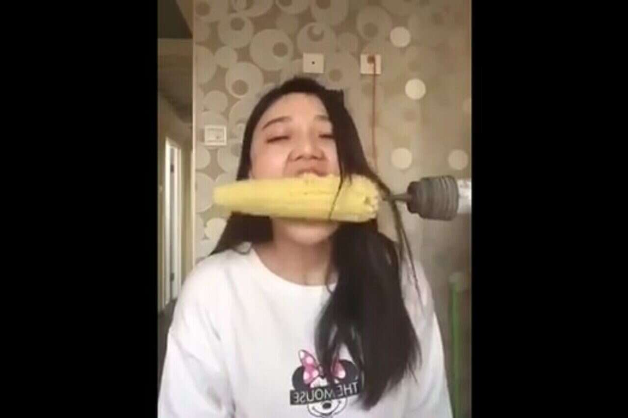 בשניות הראשונות נראה שהולך לה לא רע בכלל. היא מכינה את עצמה לתרגיל ופותחת את הלסתות, המקדחה מסתובבת וקלח התירס מוכן להיאכל. לאחר מכן, הדברים הולכים ונעשים מביכים.