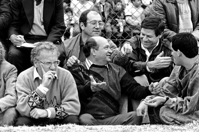 1985, חיים יבין, יהושע מצא, אהוד אולמרט ורובי ריבלין במגרש ימק"א בירושלים. האוהדים השרופים של בית"ר // צילום: משה שי