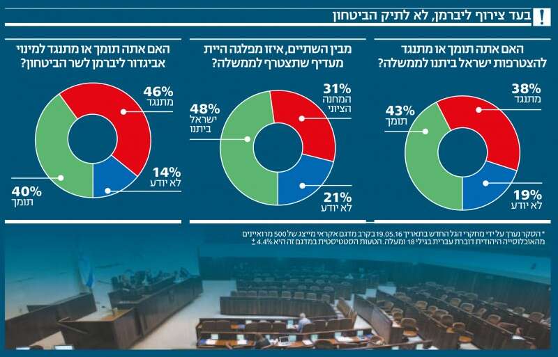 סקר "ישראל היום" ו"הגל החדש" מצא כי 43% מהציבור תומכים בצירוף ישראל ביתנו לממשלה, ואילו 38% מתנגדים. 48% מהציבור מעדיפים את צירוף מפלגתו של ליברמן לקואליציה, לעומת 31% שהיו מעדיפים לראות את המחנה הציוני ליד שולחן הממשלה. בה בעת נמצא כי 46% מהציבור מתנגדים למינוי ליברמן לשר הביטחון, בעוד 40% תומכים (ראו גרף למעלה).
