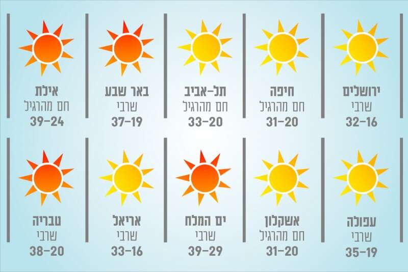 אחרי התחממות שחלה במהלך סוף השבוע, היום (ראשון) תחול עליה ניכּרת בטמפרטורות וייעשה חם מהרגיל עד שרבי. בשעות הלילה יישבר השרב תוך התחזקות הרוחות. לקראת שעות הבוקר של יום שני יתכן טפטוף עד גשם מקומי קל.