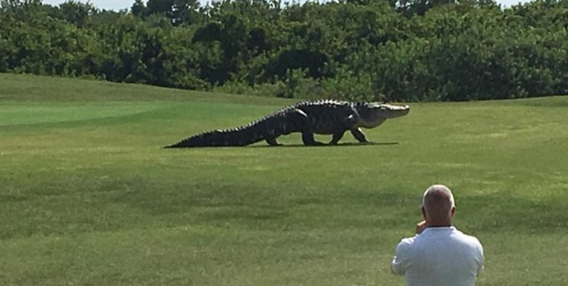 מגרש גולף או פארק היורה? צ'ארלס הלמס, שחקן גולף חובב ששיחק בשבוע שעבר במגרש פלמטו שבפלורידה, תיעד אליגטור ענק שחצה להנאתו את המגרש.