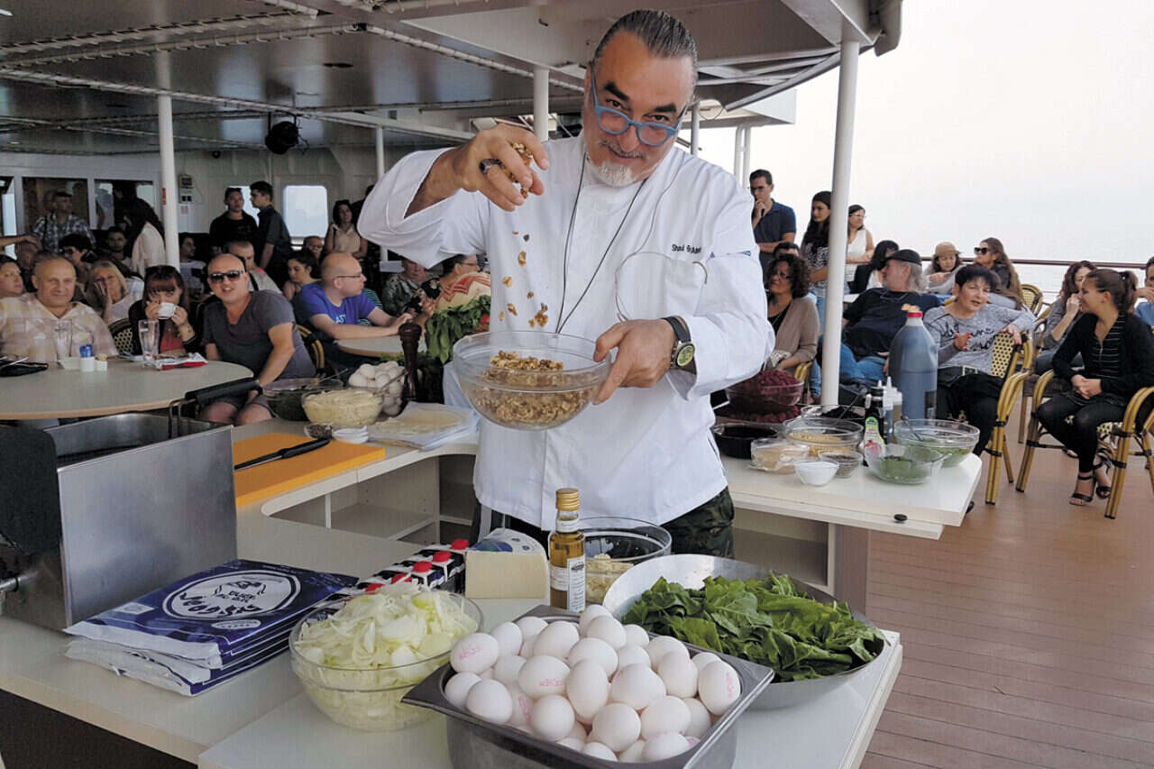 האונייה כבר בלב ים, אולמות הבידור שוקקים, צוות הבידור כבר מנעים את זמנם של הילדים בשלל פעילויות, הקזינו וחנות הדיוטי פרי בפעילות שיא, המרפסת הפתוחה על הסיפון בקומה 6 מתמלאת בנופשים, הקפה והבירה הצוננת זורמים כמים ובכל מקום מוסיקת רקע נעימה. השף שאול בן אדרת כבר בעיצומה של סדנה, מלמד מאות מנוסעי האונייה כיצד להכין בוריק עלי סיגר במילוי ביצה, תפוחי אדמה ותרד וגם שקשוקה תרד, ביצים וגבינת קשקבל.