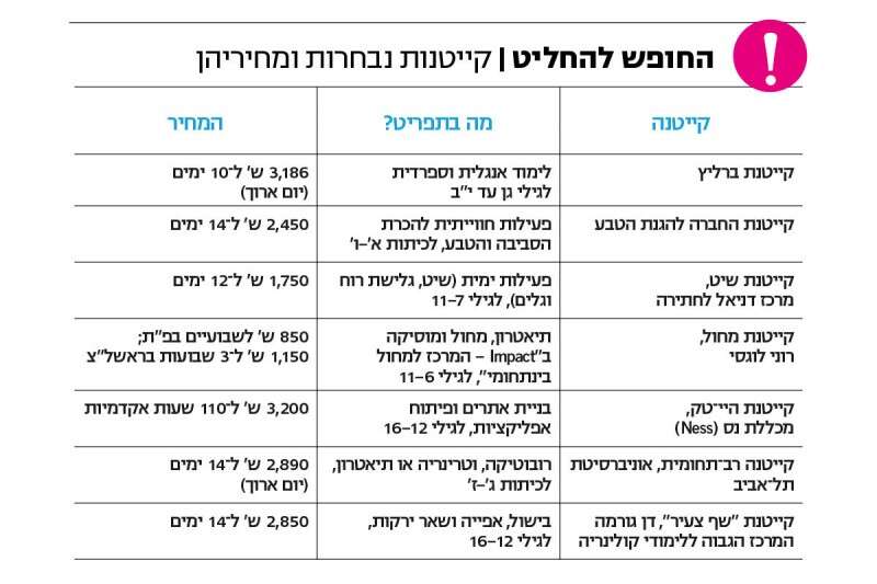 מחנה קיץ נוסח הישרדות, שיתקיים במשך חמישה ימים, יעלה 980 ש' לילד. חברת קאמפ קימאמה מציעה את מחנה הקיץ היוקרתי "קימאמה ניו יורק", המפגיש בני נוער ישראלים עם בני נוער אמריקנים ונמשך שלושה שבועות וחצי באפ־סטייט ניו יורק. המחיר לילד: 16,800 ש', והוא כולל שלל אטרקציות חלומיות.