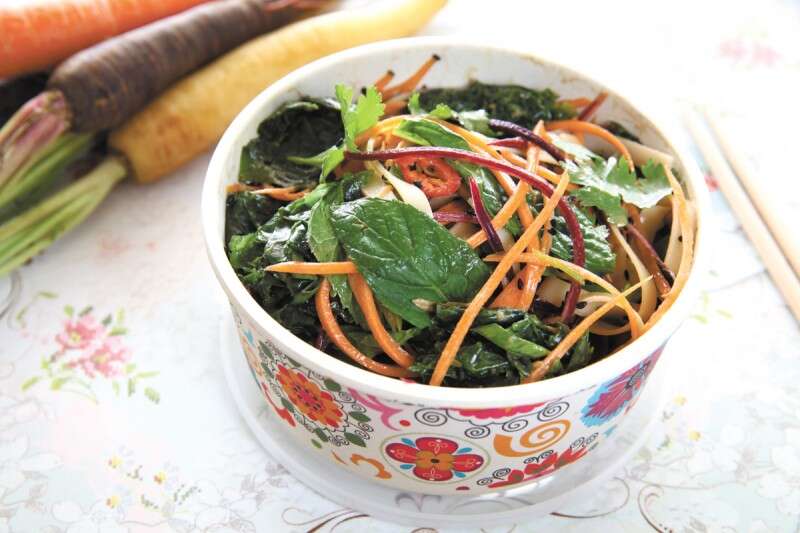 סלט נודלס עם גזרים צבעוניים, אצות ורוטב טחינה // צילום: לירון אלמוג, הכלים באדיבות "הכלבו" מבית כלבו עידית