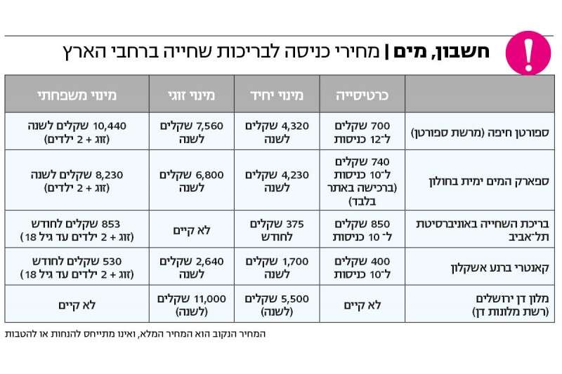 על פי נתוני ארגון מנהלי הבריכות, עולה כי כ־15% מהאוכלוסייה בישראל מנויה בבריכות שחייה ובמועדוני נופש. "מדובר במגמה מבורכת שרק עולה כל הזמן ויש לכך הרבה סיבות", אומר אלמוג אבי, יו"ר ארגון בריכות שחייה, מרכזי ספורט ונופש בישראל. "בין שמדובר במודעות צוברת תאוצה בכל מה שקשור באורח חיים בריא ובין שמדובר במשפחה שמחפשת תעסוקה לילדים בחופשת הקיץ המתמשכת". כצפוי, רובנו מנצלים את הבריכה בחודשי הקיץ (יוני-אוגוסט). מבדיקה שערכנו עולה כי במקומות רבים מוצע מינוי עונתי, הכולל מינוי לארבעה או לשלושה חודשים. קניית מינוי כזה משתלמת לזוג או למשפחה עם ילדים שיודעת שבשאר חודשי השנה המינוי לא ינוצל כראוי ומדובר בחיסכון גדול בהוצאה המשפחתית השנתית. בוועדי עובדים ובמועדוני חברים רבים מוצעות הנחות למנויים, ולכן שווה לבדוק ולהשוות בטרם תרכשו מינוי. מחיר הכניסה לבריכה ומחיר המינוי נגזרים מגודל הבריכה, האטרקציות והשירותים הניתנים. פרט לגודל ולמרחבים קיים שוני גדול בין בריכות פרטיות, בריכות ציבוריות, עירוניות ואלה שנמצאות במרכזי נופש או בבתי מלון. "מחירי הכניסה למרכזי הנופש והספורט יהיו בדרך כלל גבוהים יותר", מציין אבי, "לכן חשוב לבדוק את המחיר ואת ההיצע בהתאם להעדפות. אם המינוי הוא למטרות בילוי או שבכוונתכם להגיע למקום כדי לשחות ולשמור על כושר - מדובר בשני דברים שונים".