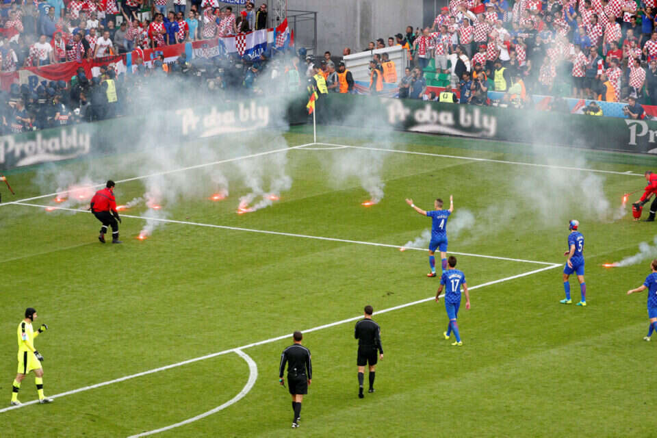 "הם חוליגנים, טרוריסטים של ספורט. אין דרך אחרת לתאר אותם", אמר המאמן אנטה צ'אצ'יץ, קורבן נוסף של אותם פורעי חוק, בסיום ה־2:2 מול צ'כיה. חמש דקות לסיום המשחק, ביתרון 1:2 לקרואטיה, נזרקו עשרות אבוקות מיציע האוהדים באקט מתוכנן ומתואם. "השוטרים הגיעו למקום כמה דקות לפני שזה קרה כי הם ידעו שמשהו עומד להתרחש", סיפר העיתונאי אנדי מיטאן, שהיה ביציע. ואכן, שעתיים לפני המשחק דלפה לרשת תמונת תרשים של האיצטדיון בסנט אטיין ועליה שרטוט מדויק של פעולות האוהדים כפי שהתרחשו באמת. האירוע המביש, שהביא לעצירת המשחק לכעשר דקות, הוציא את הקרואטים מאיפוס ובתוספת הזמן הם ספגו מהנקודה הלבנה את שער השוויון. "אנחנו מתנצלים בפני כולם, אבל יש פה כמה אנשים שמנסים להרוס לנו הכל", אמר המצטיין במשחק איבן ראקיטיץ'. "אולי עדיף שלא נשחק בכלל אם דברים כאלה ממשיכים לקרות", הוסיף כובש השער הראשון איבן פרישיץ'.