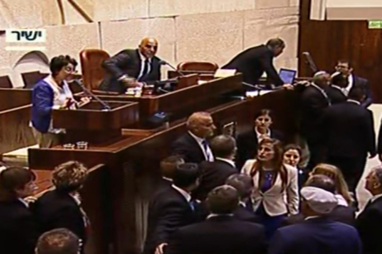 דבריה הקפיצו ממקומם את הח"כים שכמה מהם קמו על רגליהם, הסתערו על דוכן הנואמים ודרשו ממ"מ יו"ר הכנסת ח"כ חמד עמאר (ישראל ביתנו) להוריד אותה מדוכן הנואמים. ח"כ מיקי לוי (הבית היהודי) נופף בידיו וקרא לעבר זועבי "טינופת". גם ח"כ אורן חזן (ליכוד) תבע להוריד את זועבי מהדוכן.