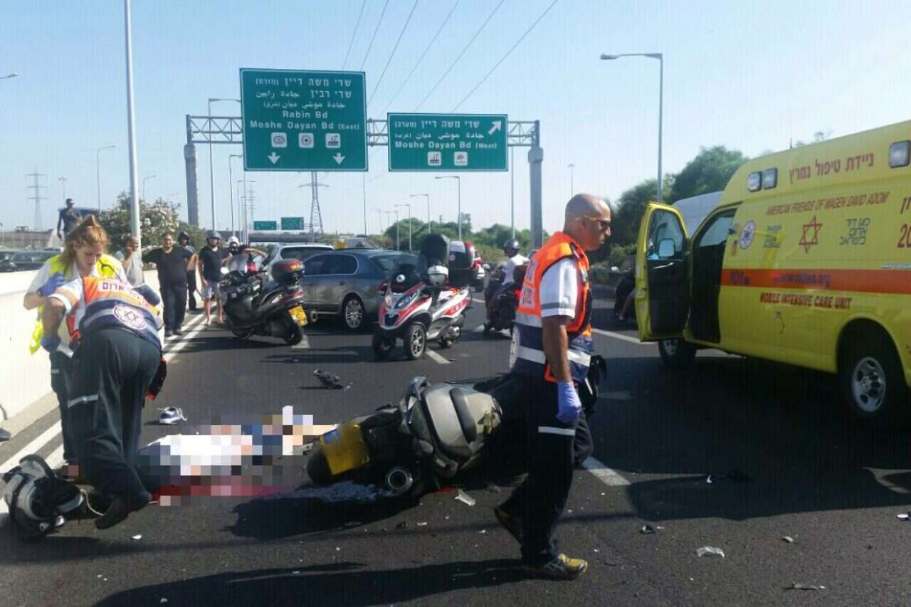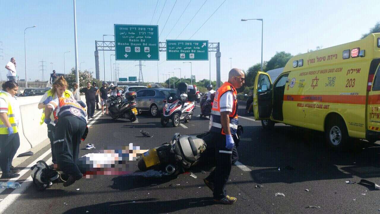 רוכב אופנוע כבן 30 נהרג תאונת דרכים בכביש איילון דרום, סמוך למחלף משה דיין. חובשים ופאראמדיקים של מגן דוד אדום העניקו לגבר טיפול רפואי במקום וביצעו פעולות החייאה, אך נאלצו נקבע מותו.