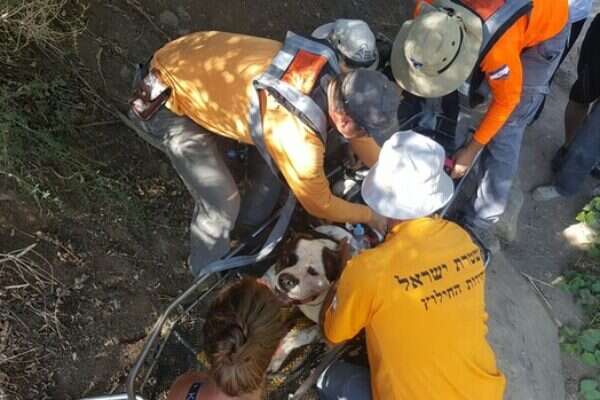 חילוץ אחד כלבים התאפשר רק בסיוע פינויו באלונקה // צילום: דוברות המשטרה