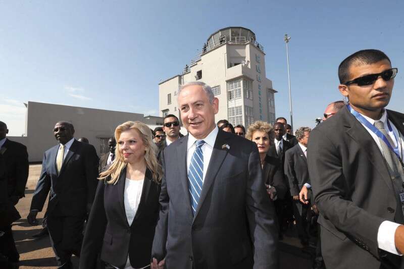 רה"מ נתניהו ורעייתו שרה ליד מגדל הפיקוח באנטבה // צילום: זיו קורן