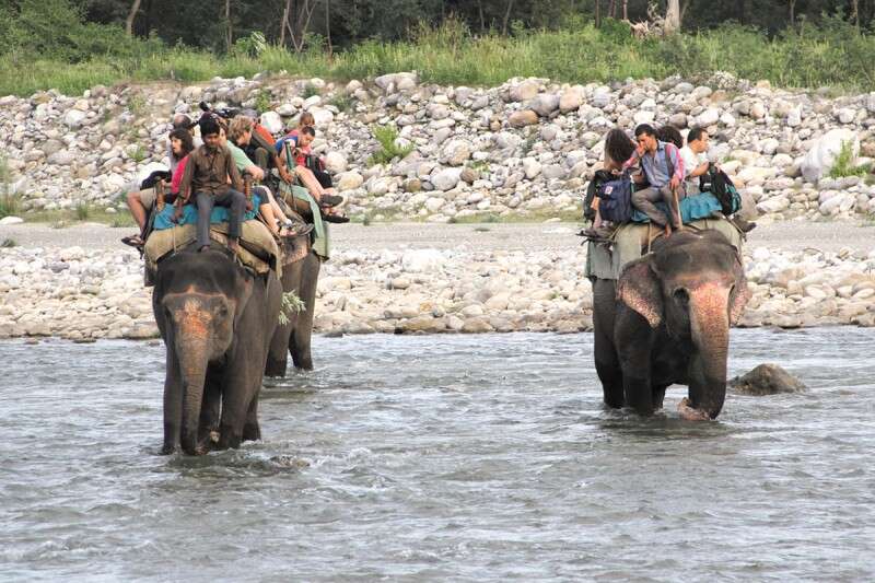 הקבוצה רוכבת על פילים בשמורת קורבט בצפון־מזרח הודו. "זה היה כיף, הלכנו עם הפיל במים", מספר עמר