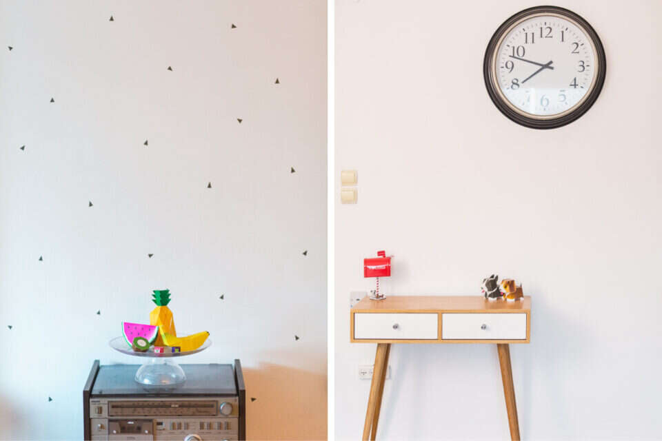 הקו המנחה שבחרו הוא מינימליסטי ונקי, בשילוב של אלמנטים גרפיים וצורות גאומטריות. כך למשל, כבר בכניסה לדירה מקדמת אותנו בברכה שידה בעלת רגליים ארוכות בסגנון רטרו, כשעליה מונחות שתי בובות כלבים מקיפולי נייר שהכינה איילת ודגם מיניאטורי של תיבת דואר. עדות נוספת לאהבתה של איילת לעבודות יצירה ניתן לראות גם מימין לשידה, כשביקשה לתחום את האזור שמתחת למזגן. בעזרת חתיכות וואשי-טייפ שגזרה יצרה קישוט לקיר, ולהשלמת המראה הפופ-ארטי הניחה פירות מקיפולי נייר על גבי פטיפון ישן (שעדיין עובד!) אותו הביא תומר מבית סבתו.