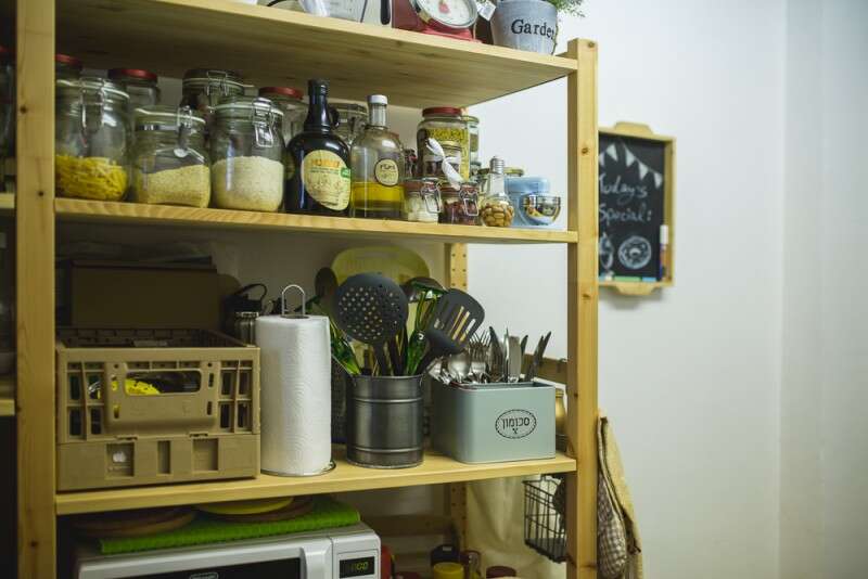 במטבח עצמו, שהוא בן כמה עשרות שנים ואיננו גדול, פתרו את בעיית האחסון בכך שהציבו יחידת מדפים פשוטה אך פונקציונלית מעץ. על המדפים סידרו בצורה גלויה וזמינה צנצנות שקופות עם חומרי גלם איתם הם נוהגים לבשל. להשלמת חווית הבישול, תלו מגש מעץ שהוסב למעין "תפריט יומי" משתנה.