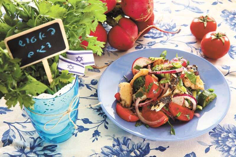 5. מערבבים בעדינות את הירקות עם עשבי התיבול, הדגים ופיסות הפיתה הקלויה, מתבלים בתערובת שמן הזית והלימון ומגישים מייד.