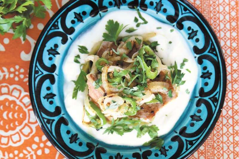 4. על צלחת הגשה מסדרים טבעת היקפית של יוגורט סמיך ובמרכזה את הטונה עם שמן הזית המתובל בבצל, בכוסברה ובפלפל חריף.