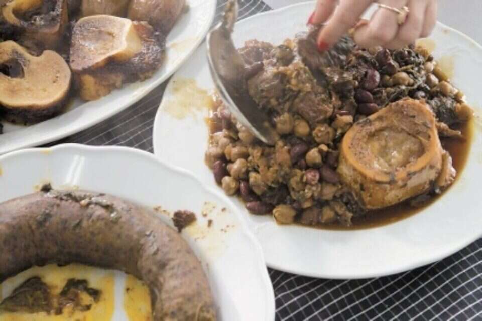 מחממים בסיר רחב, גבוה וכבד את השמן ומטגנים את הבצל, על אש קטנה, עד שישחים. בזמן הזה מכינים את הקציצה המתוקה. שמים את כל החומרים במעבד מזון ומעבדים למחית חלקה. ממלאים רגל אחת של גרב הניילון, קושרים קשר במרחק כעשרה ס"מ מקצה הנקניק ומעצבים צורת נקניק בעובי של כ-10 ס"מ ומניחים במקרר. חוזרים אל הסיר. מעל הבצל השחום מניחים את עלי המנגולד ונתחי השפונדרה ומטגנים קלות. מניחים את גרגירי החומוס, השעועית, הלחי, פרוסות הרגל וראשי השום. יוצקים מים עד לכיסוי הקטניות, מביאים לרתיחה ומבשלים על אש קטנה משך כחצי שעה. מסירים את הקצף.