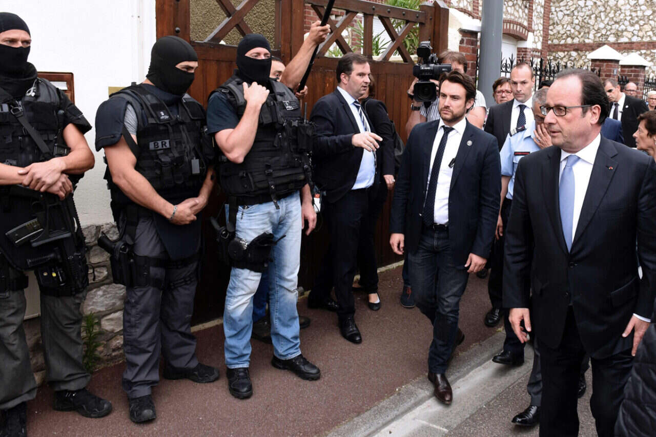 נשיא צרפת, פרנסואה הולנד, הגיע מהר מאוד לזירת הפיגוע מלווה בשר הפנים ברנאר קזנוב. הולנד מיהר להכריז על הפיגוע כפיגוע של ארגון המדינה האיסלאמית ואמר כי המפגעים מבקשים לפלג את צרפת. הוא אמר כי יארח עוד באותו היום את הארכיבישוף של נורמנדי, וכי היום יארח בארמון האליזה נציגים של כל הדתות מאחר שכולם על הכוונת של דאעש. "צרפת במלחמה", חזר והכריז הולנד כפי שהצהיר כבר אחרי הפיגועים הקטלניים של חודש נובמבר, "הצרפתים צריכים לדעת כי הם מאוימים. הם לא היחידים, גם הגרמנים ומדינות אחרות".