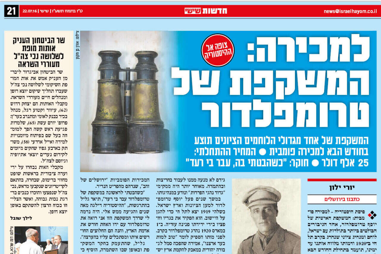 ההחלטה התקבלה בעקבות הפרסום הבלעדי ב"ישראל היום" ב־22 ביולי על כך שהמשקפת האישית של טרומפלדור, אחד הגיבורים הבולטים ביותר בתולדות עם ישראל, תעמוד למכירה פומבית במחיר פתיחה של 25 אלף דולרים.