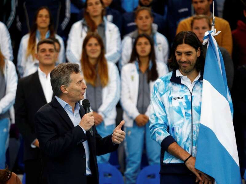 לואיס סקולה, נושא דגל המשלחת, עם נשיא ארגנטינה מאוריסיו מאקרי // צילום: רויטרס
