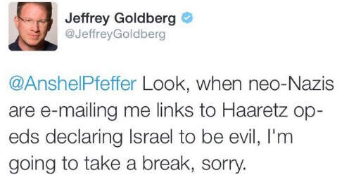 גולדברג היהודי, שבעבר מתח גם ביקורת חריפה על נתניהו, כותב במגזין "אטלנטיק" ומרבה לעסוק בסוגיות של ישראל ויהודי ארה"ב. בציוץ נוסף הוא ציין כי הוא אוהב רבים מעובדי "הארץ" וחלק גדול מהדעות המופיעות שם, "אבל האנטי־ישראליות והאנטישמיות הקריקטוריסטיות יכולות לצרום". אל הוויכוח הצטרף העיתונאי אנשיל פפר שצייץ "עוד סיבוב של הכפשת 'הארץ' על ידי ג'פרי גולדברג ואחרים". בתגובה, צייץ גולדברג: "קח אחריות על מה שמופיע בעיתון שלך, הארץ, שכמו כל דבר, אינו מעל הביקורת". במסגרת הדיון שהתפתח ביניהם גולדברג צייץ לפפר כי הוא קיבל מיילים מניאו־נאצים "עם קישורים לטורי דעה של 'הארץ' שבהם מוצהר שישראל מרושעת".