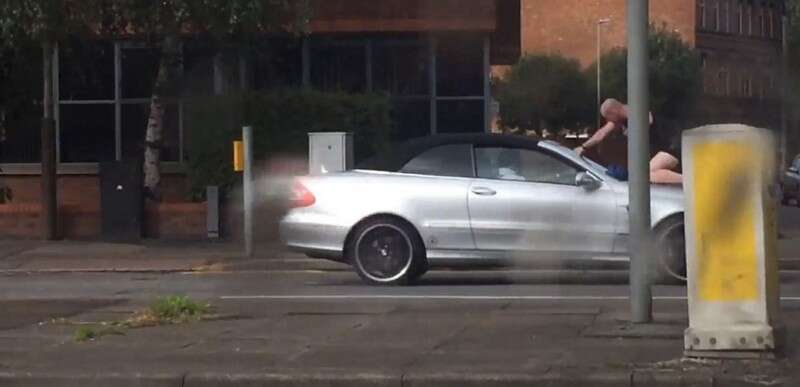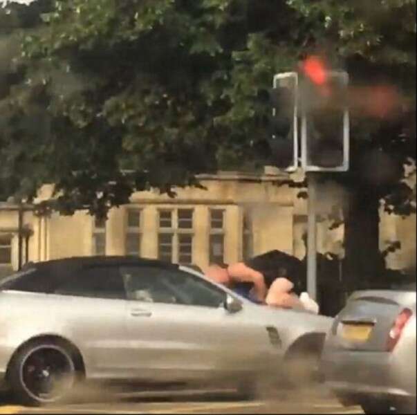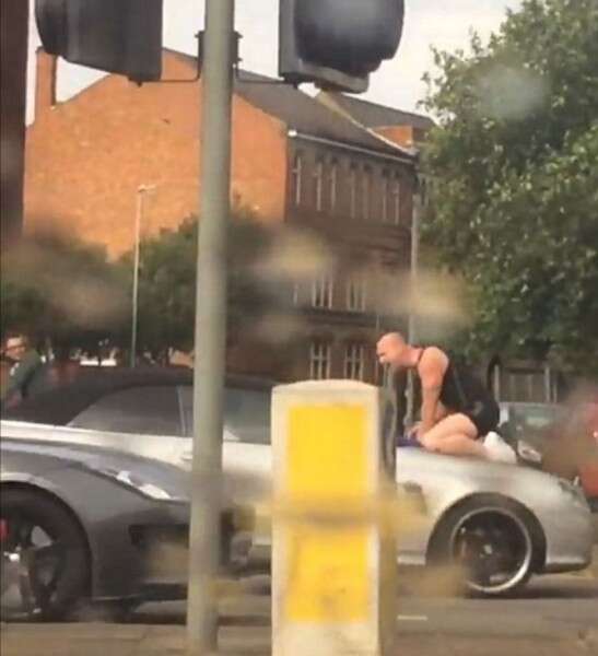 אנגלי עצבני הותיר את הסובבים אותו המומים כאשר התיישב על רכב באמצע הכביש והחל להכות את השמשה