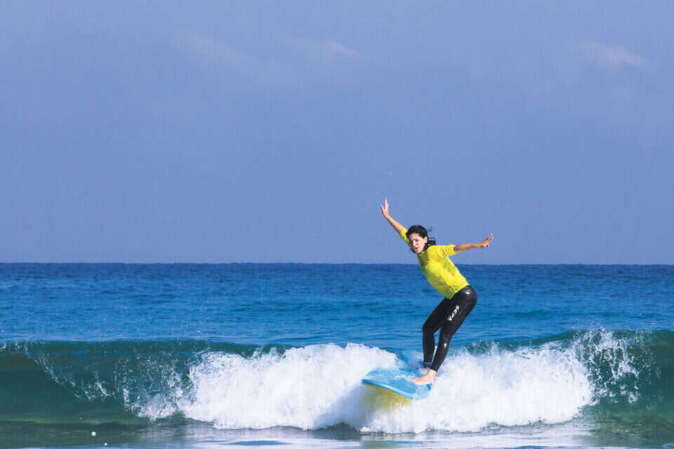 בשיעור השני אנחנו מנסות לעשות את זה מוקדם בבוקר, מעיין ואני במים של יפו. כמה יפה העיר הזאת, כמעט כמו השכירות שאני משלמת כדי לגור בה. משמאלי הנמל, מימיני חבורת גולשים שמכורים לים. קמים בשש לתפוס גל, מתעדכנים באפליקציה מיוחדת מתי יש גלים ולובשים טייץ בגאווה. בהם גם כמה נשים בודדות. לא נורא, יותר גברים בשבילי. מי שמפחדת, שתישאר על החוף. לי גם ככה אין מה להפסיד.