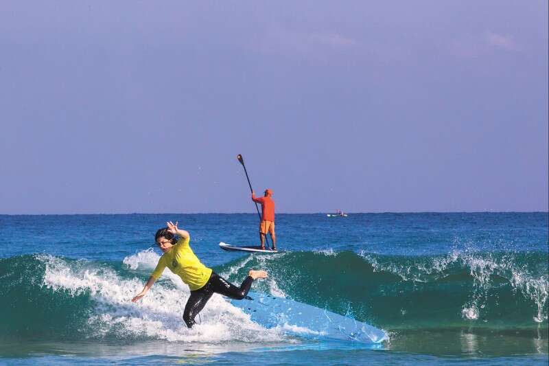 רצועת החוף כאן ממש בתולית, שזאת דרך להגיד שאני פה לבד. אחרי שאני עולה על חולצת גלישה דקה וטייץ שלא עולה עלי, אנחנו הולכים לתרגל גלישה על סאפ, הלהיט התורן של הים בשלוש השנים האחרונות. גלשן גדול בהרבה מגלשן הגלים הקלאסי, שמה לא עושים עליו? יוגה, זומבה, שנ"צ.