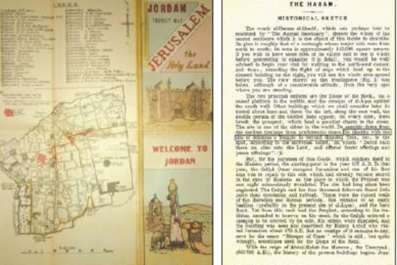 מימין: מדריך תולדות הר הבית, משמאל: מפת תיירות ירדנית // צילום: חיים שטיינברגר // מימין: מדריך תולדות הר הבית, משמאל: מפת תיירות ירדנית // צילום: חיים שטיינברגר