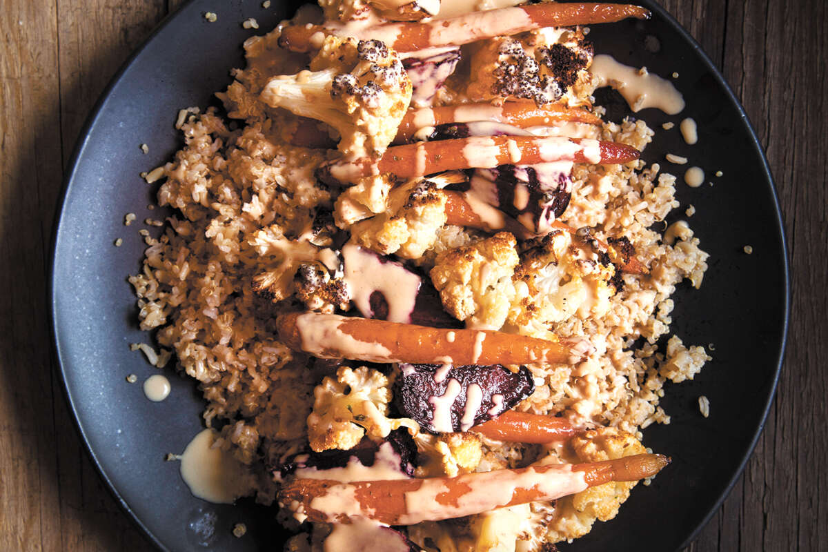 אצלי זה עובד ככה: בתחילת השבוע אני מכינה סיר ענקי של אורז, ובכל יום משחקת עם תוספות אחרות. כאן לקחתי את התבשיל לכיוון האסיאתי, עם רוטב מיסו־טחינה סמיך, מלא בטעמי אוממי, והוספתי המון ירקות צלויים וקינואה. התבשיל הזה מצוין גם לאירוח - אני מכינה אותו תמיד כשאני רוצה להעמיד קערה גדולה מלאה בגודיז במרכז השולחן.