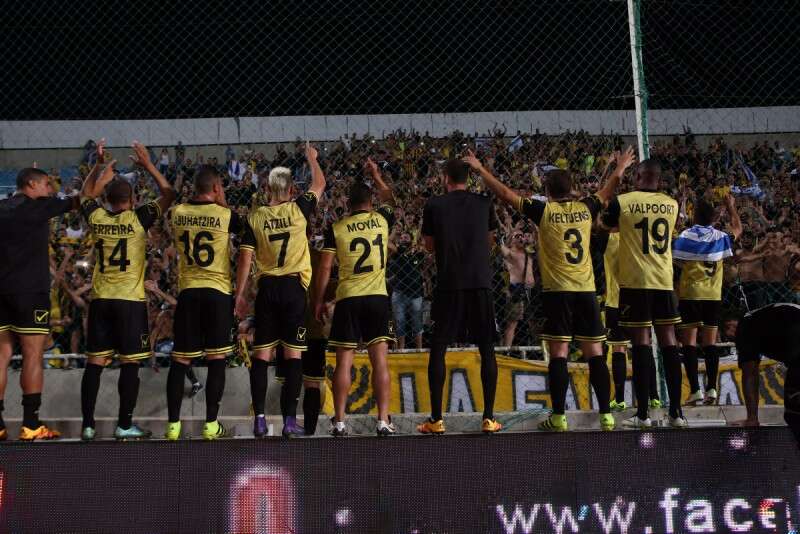 אוהדי בית"ר ירושלים עם שחקני הקבוצה. תמיד דופקים אותם? // צילום: אלן שיבר
