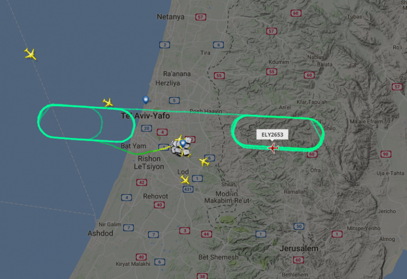 מטוס אל על (מסומן באדום) מבצע סיבובים בשמי השומרון ועד לים // צילום מסך מתוך אתר flightradar24