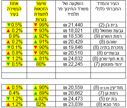 בבת-ים רושמים ירידה חיובית באחוזי הנשירה. המשמעות היא שהצליחו למנוע מיותר תלמידים להיפלט ממערכת החינוך, הדבר אף לא פגע בשיעור הזכאים לתעודת בגרות שאף עלה מ-79% ל-82%. עם זאת רשמו שם עליה שלילית בכל הנוגע למחברות בחינה פסולות וטוהר הבחינות. בכפר סבא למשל אחוז הנושרים מבתי הספר בעיר עלה, אך הזכאות לבגרות בשיעור של 82% נשארה כפי שהייתה. יתרה מזאת, גם מספר בחינות הבגרות הפסולות בשל טוהר החינות עלה. במודיעין אחוז הזכאים לתעודת בגרות עלה ל-90%, אך גם הנשירו יותר תלמידים חלשים מבתי הספר, כמו כן יש עליה שלילית במספר מחברות הבחינה הפסולות. גם ברמת גן יכולים לחייך: אחוז הזכאות לבגרות עומד שם על 89% כאשר אחוז הנושרים נותר ללא שינוי. בעיר גם שיפרו את ההישגים בכל הנוגע לתעודות בגרות מצטיינות מעל ציון 90