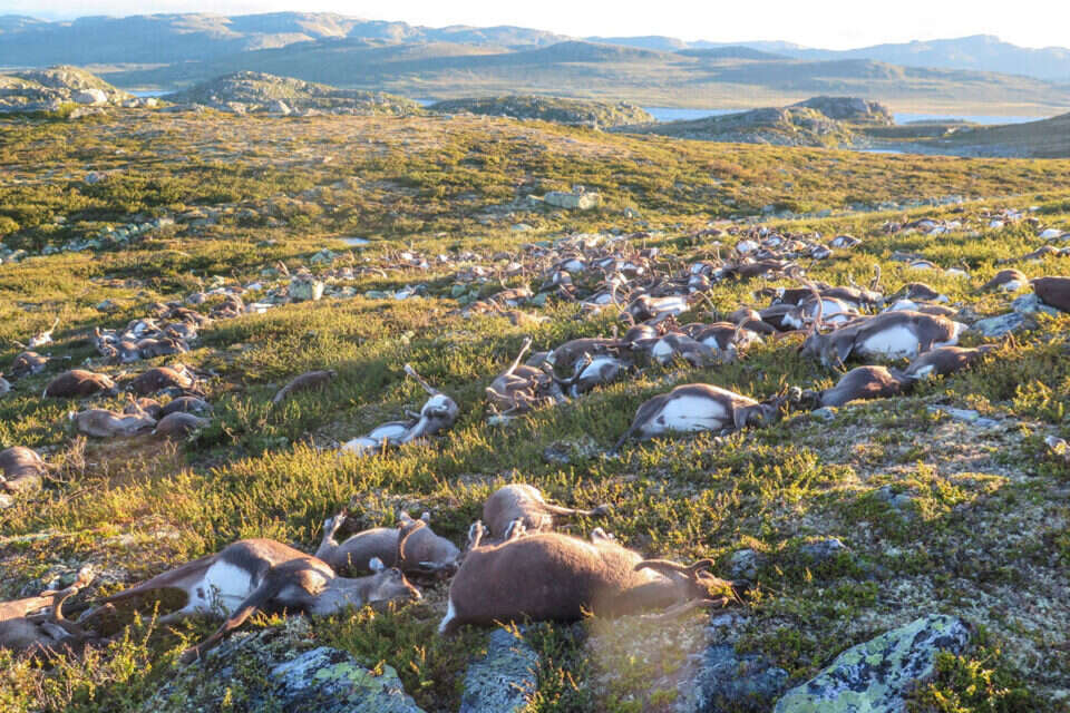 "אסון טבע חריג בגודלו", כך הגדירו נציגים של רשויות הטבע בנורבגיה את מותם של 323 איילים לאחר שנפגעו ממכת ברק עוצמתית במרכז המדינה הסקנדינבית, ברמת הר הרדאנגרבידה.