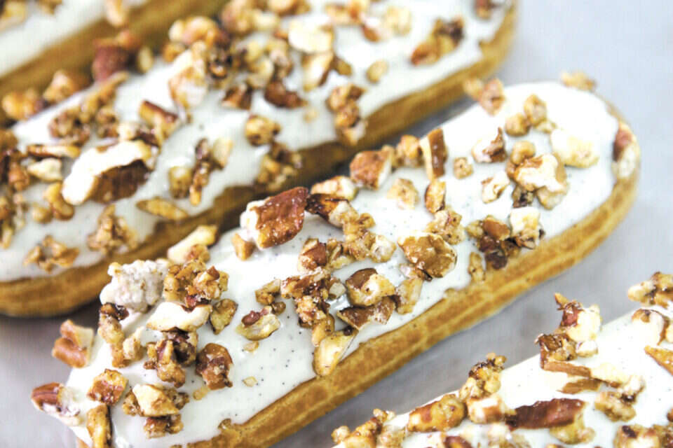 מרכיבים את המנה: בעזרת סכין קטנה יוצרים חורים בתחתית האקלר ומזלפים דרכם את קרם הקפה עד שהאקלר מלא לגמרי. טובלים את האקלר בציפוי ומפזרים פקאן סיני קצוץ.
