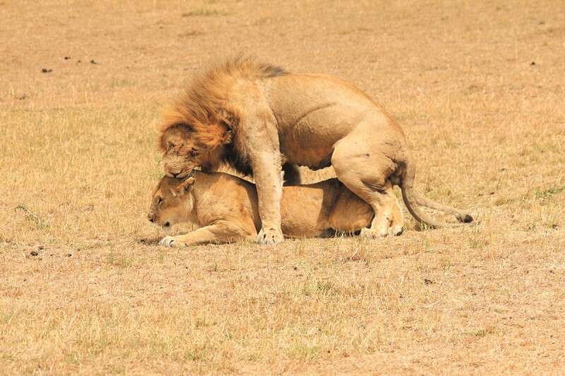 כשהלביאה מתיישבת לפני האריה, הוא מבין שקיבל את אישורה, קם ממקומו וגוחן עליה לזיווג, שאורך דקה. בסיומה מתגלגלת הלביאה על הגב.