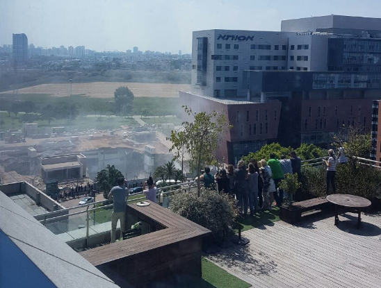 עובדים בבניין סמוך מביטים באזור האסון // צילום: דפי לבל