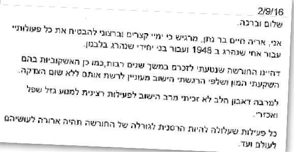 אריה בר נתן בן ה־85, ששם קץ לחייו ביום שישי על קבר בנו חיים בחלקה הצבאית בהר הרצל בירושלים, השאיר מכתב אחרון שאותו חיבר זמן קצר לפני שירה בעצמו.