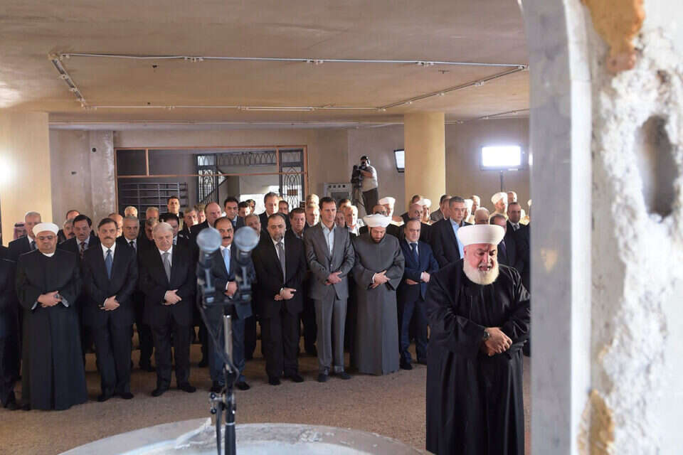 בצילומים נראה הנשיא הסורי כשהוא מגיע במכונית וללא אבטחה למסגד ומתפלל בו. בכלי התקשורת הערביים דווח כי הצילומים של הנשיא הסורי מגיע להתפלל במסגד כשהוא ללא מאבטחים, נועדו להעביר מסר ולפיו הממשל הסורי שולט בנעשה בבירה ובחלקים אחרים במדינה, חרף הדיווחים כי חלקים רבים משטחה של סוריה אינם בשליטת משטר אסד.